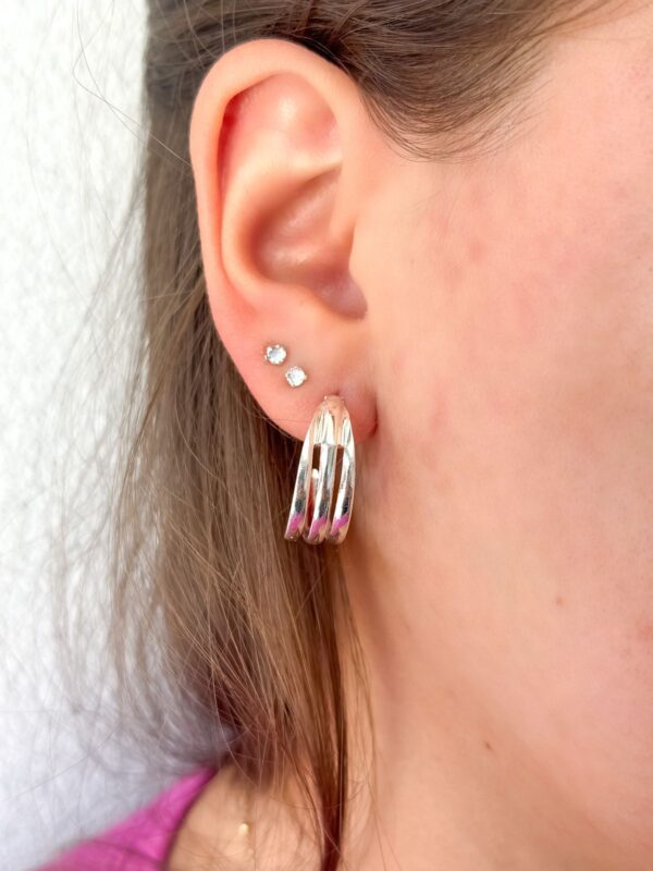 Argola tripla média banhado em prata, com fecho de tarraxa.