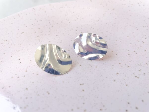Brinco moeda martelada banhado em prata, com fecho de tarraxa.