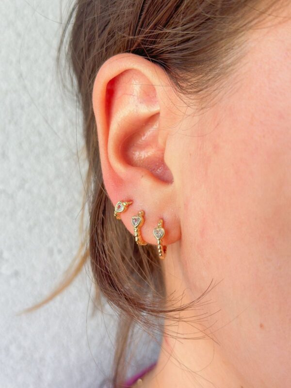 Trio argola com detalhe de coração banhado em ouro 18, cravejado com zircônia transparente.
